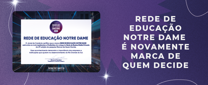 A Rede de Educação Notre Dame segue entre as mais lembradas e preferidas do Rio Grande do Sul na categoria Rede de Ensino Médio Privada, conforme aponta a pesquisa Marcas de Quem Decide. Promovido pelo Jornal do Comércio há 27 anos, o estudo é realizado pelo Instituto Pesquisas de Opinião (IPO) e é o único no Estado que mede a lembrança e a preferência das lideranças gaúchas. Em sua mais recente edição, foram realizadas 400 entrevistas, em 47 cidades com participação igual ou superior a 0,5% do PIB gaúcho. Nelas, 172 perguntas abertas foram respondidas. Saiba mais: